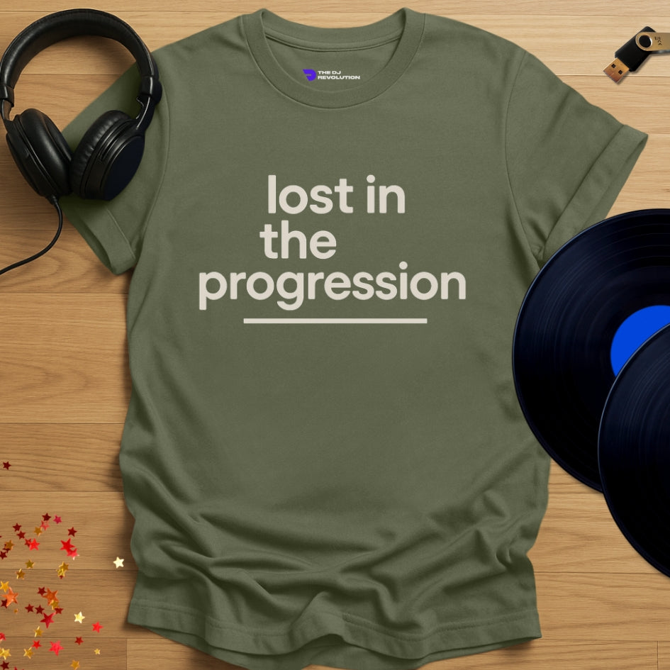 Lost in the Progression features soft off-white text in a clean stacked layout — a nod to the hypnotic builds of progressive house and techno. Printed on our comfy unisex cotton tee, it’s a minimalist look for melodic music lovers.